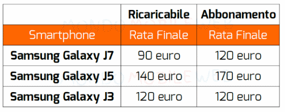 3. Samsung Galaxy J7:  l’offerta Ricaricabile prevede un costo di 7 euro al mese e un anticipo di 49,90 euro, mentre la Magnum un costo di 6 euro ogni 4 settimane ed un anticipo di 49,90 euro. Il pagamento, in questo caso, deve essere effettuato soltanto tramite carta di credito. Il J7 è caratterizzato da un processore Exynos 7870 Octa Core con sistema Android 7.0, 3 GB di RAM, 16 GB di ROM, Display SuperAMOLED 1080×1920 da 5,5″ ed una fotocamera da 13 Mpix.