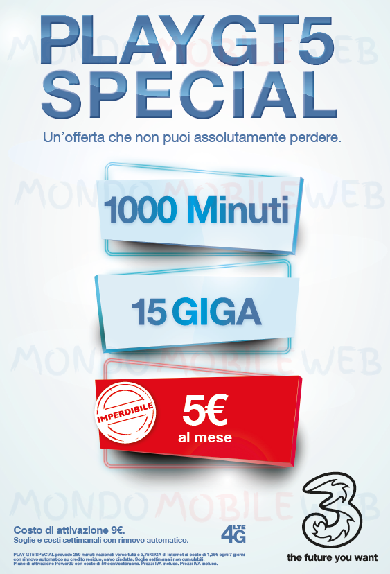 Se siete clienti Tim e Operatori Virtuali, avete ricevuto questo SMS informativo e avete deciso di passare a 3 con Play GT5 Special, noi di MondoMobileWeb vi consigliamo di non attivare questa promozione ma richiedere, salvo eventuali cambiamenti, il codice coupon dell’offerta Play GT5 Super che offre 1,25GB alla settimana in più allo stesso prezzo.