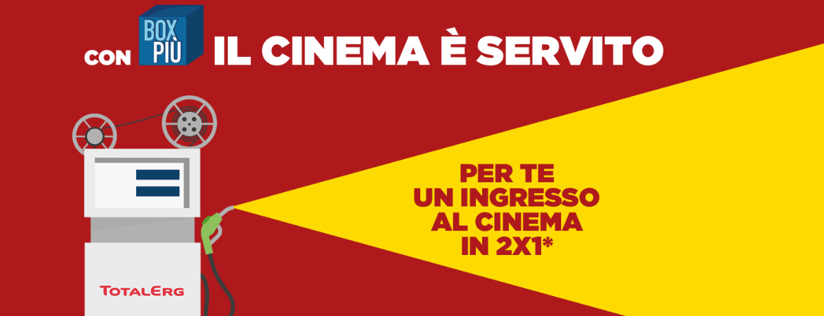 Tutti i clienti possessori di Carta Box Più che dal 15 Novembre 2017 al 15 Gennaio 2018 (salvo eventuali proroghe) faranno un rifornimento di carburante del valore minimo di 25 euro, in modalità servito nei Punti Vendita aderenti, o di una ricarica telefonica ERG Mobile del valore minimo di 10 euro otterranno un voucher cinema in modalità “2×1”.