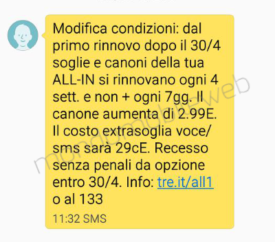 “Modifica condizioni: dal primo rinnovo dopo il 30 Aprile 2017 soglie e canoni della tua offerta ALL-IN si rinnovano ogni 4 settimane e non più ogni 7 giorni. Il canone aumenta di 2,99 euro. Il costo extrasoglia voce/sms sarà 29 centesimi di euro. Recesso senza penali da opzione entro 30/4. Info: tre.it/all1 o al 133“.