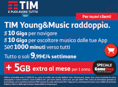 Tutti i nuovi clienti Under 30 possono attivare nei negozi GameStop aderenti all’iniziativa la promozione Tim Young&Music Raddoppia con 5GB extra al mese per 1 anno.