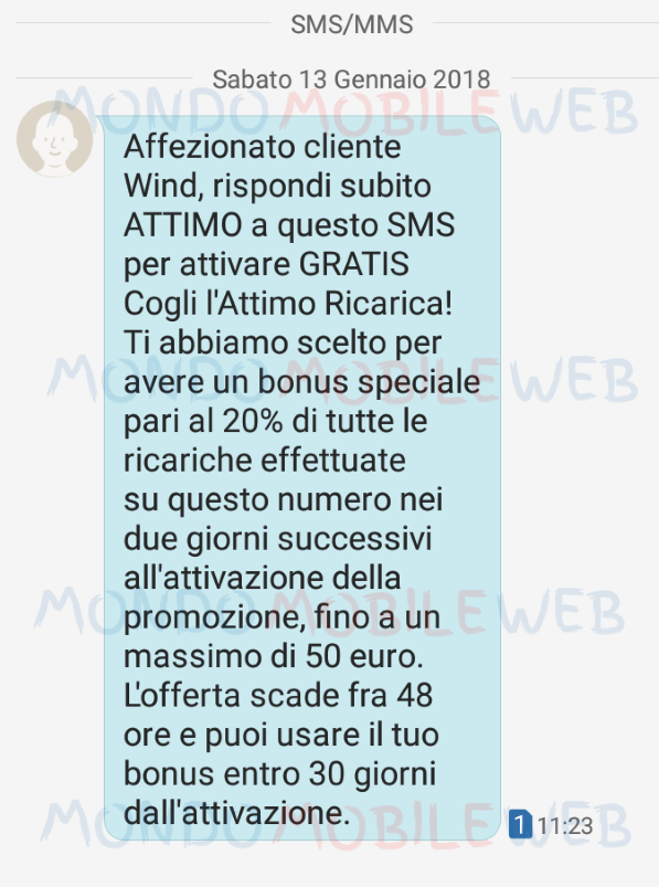 Ecco l’sms inviato con mittente 40400 da Wind ai clienti coinvolti: “Affenzionato cliente Wind, rispondi subito ATTIMO a questo SMS per attivare GRATIS Cogli l’Attimo Ricarica! Ti abbiamo scelto per avere un bonus speciale pari al 20% di tutte le ricariche effettuate su questo numero nei due giorni successivi all’attivazione della promozione, fino ad un massimo di 50 euro. L’offerta scade fra 48 ore e puoi usare il tuo bonus entro 30 giorni dall’attivazione“.