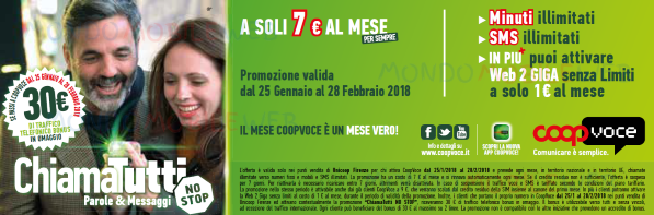 E’ attivabile dal 25 Gennaio al 28 Febbraio 2018 dai nuovi e già clienti CoopVoce. Per i nuovi clienti è previsto solo il costo della nuova SIM ricaricabile di 10 euro con 5 euro di traffico. I già clienti dovranno pagare un costo di attivazione di 9 euro. Se il credito residuo non è sufficiente, l’offerta è sospesa per 7 giorni. Per riattivarla è necessario ricaricare entro 7 giorni, altrimenti verrà disattivata. In caso di sospensione il traffico voce e SMS è tariffato secondo le condizioni del piano tariffario.
