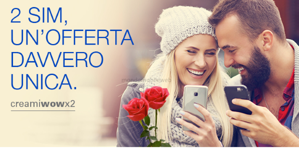 CREAMI WOW X2 è l’offerta ricaricabile che permette di ricevere 2 SIM con cui condividere 1000 credit per chiamate, SMS e Internet e 10GB, che corrispondono a 10240 credit validi per navigare in internet, al costo di 12 euro ogni 28 giorni. A partire dal primo rinnovo utile dal 5 Aprile 2018, l’offerta si rinnoverà a 12 euro al mese, addebitati, da li in poi, ogni mese lo stesso giorno.