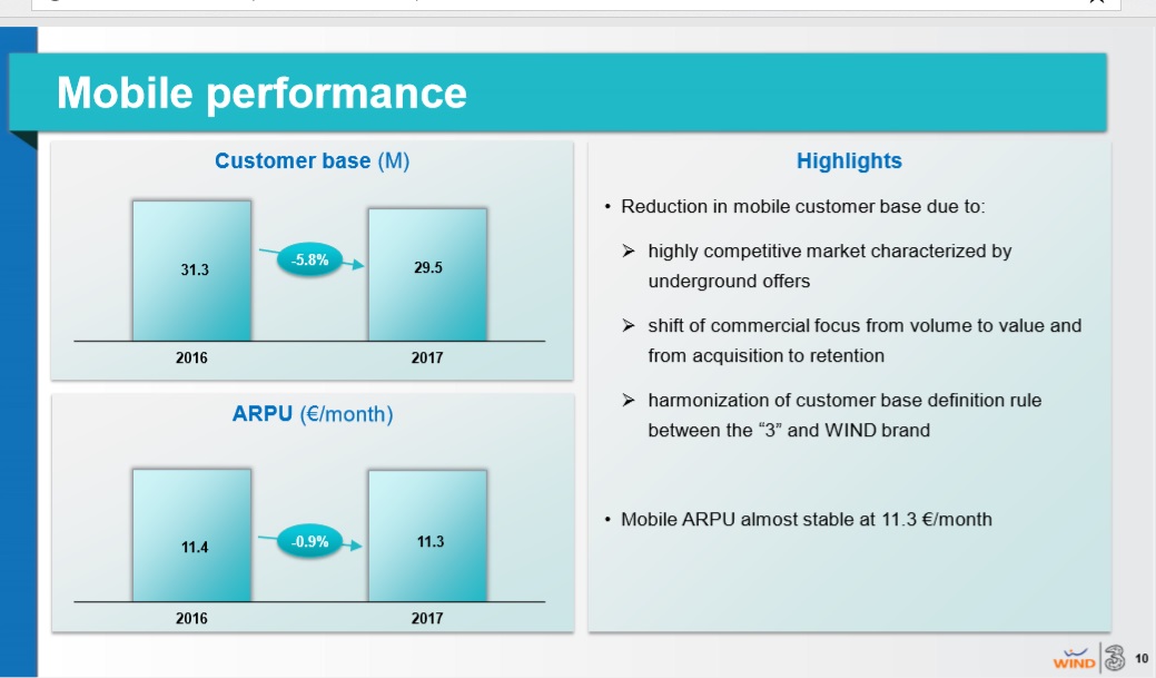 Se dinanzi ai risultati finanziari si può avere minore sensibilità, sono quelli sulla base clienti a poter dare una significativa lettura del quadro generale: dal 31 dicembre 2016 al 31 dicembre 2017 Wind Tre è passata da una base clienti di 31,3 milioni a una di 29,5 milioni.
