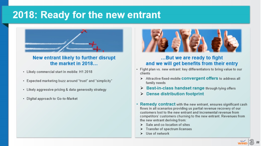 Particolarmente curiosi sono invece i riferimenti al nuovo operatore che Iliad lancerà nel mercato italiano della telefonia: Wind Tre parla di un possibile approdo nel primo trimestre del 2018, una probabile pressione sui prezzi e un aumento della fornitura di Giga all’interno dei pacchetti, e di un maggior riferimento nel marketing alla fiducia e alla semplicità. Wind Tre si dice pronta ad affrontare le nuove minacce commerciali essendo pronta a puntare sul valore e sulle offerte convergenti e beneficiando dai ricavi che deriveranno dai contratti di locazione dei siti e delle frequenze stipulati con il nuovo quarto operatore.