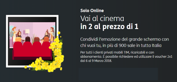 Qualsiasi cliente privato mobile TIM sia con ricaricabile che con abbonamento, avrà diritto ad un voucher gratuito che consente di andare al cinema in due al prezzo di uno, da utilizzare in una della 900 sale aderenti di tutta Italia.