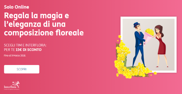 Questa iniziativa invece è pensata esclusivamente per tutti i clienti mobili TIM tradizionalisti e romantici che hanno in mente di regalare dei fiori alla propria metà. Infatti potranno usufruire di uno sconto di 15 euro da utilizzare per qualsiasi ordine di fiori o regali sul sito www.interflora.it.