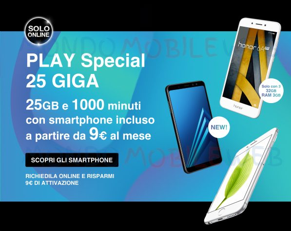 Dall’8 Marzo 2018, salvo eventuali cambiamenti ed esclusivamente tramite il sito internet, è possibile per tutti i clienti che attivano una nuova SIM, sottoscrivere gratuitamente l’offerta Play Special 25 con Smartphone incluso a partire da 9 euro al mese.