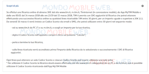 Per utilizzare il codice bonus la successiva ricarica dovrà essere effettuata dal sito www.tim.it collegandosi in versione desktop o su m.tim.it; non è possibile utilizzare il Codice Sconto ricaricando dall’App MyTIM Mobile.