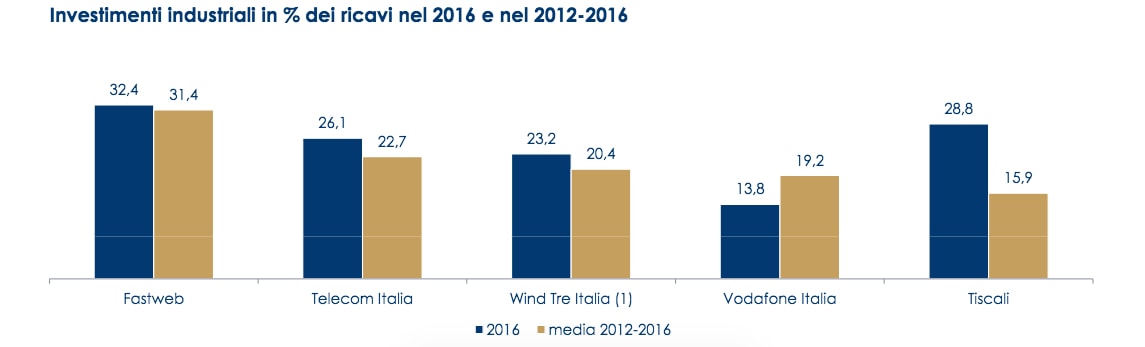 Parlando ora di investimenti, il primato spetta a Fastweb nel quinquennio che va dal 2012 al 2016, pari al 31.4% dei ricavi. Ben distaccati, TIM con il 22.7%, Wind Tre Italia con il 20.4% e Vodafone Italia con il 19.2%.
