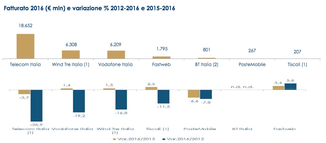 In termini di fatturato, Fastweb è stato l’unico operatore a crescere dal 2012 al 2016, con un incremento del 5.6%, mentre TIM ha subito una grave contrazione del -26.9%, e Vodafone Italia del -19.2%.