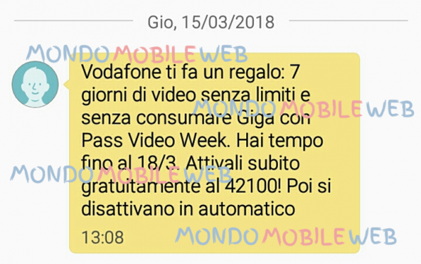 Vodafone ti fa un regalo: 7 giorni di video senza limiti e senza consumare Giga con Pass Video Week. Hai tempo fino al 18/3. Attivali subito gratuitamente al 42100! Poi si disattivano in automatico
