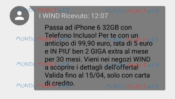 Dal 21 Marzo 2018, Wind sta inviando un SMS informativo ad alcuni clienti selezionati ricaricabili (con un’offerta attiva) per acquistare a rate lo smartphone Apple iPhone 6 32 GB a 5 euro al mese per 30 rinnovi.