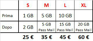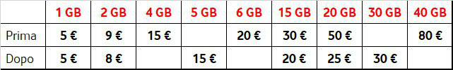 - Extra Giga New: 1 GB a 5 euro al mese, 2 GB a 8 euro al mese, 5 GB a 15 euro al mese, 15 GB a 20 euro al mese, 20 GB a 25 euro al mese, 30 GB a 30 euro al mese
