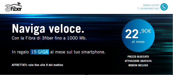 Dunque a partire da oggi e fino al 20 Aprile 2018 sarà disponibile online la promozione con modem incluso attivabile solo dalle ore 18:00 fino alle ore 09:00 del mattino successivo, parallelamente all’offerta standard. Ogni sera, infatti, a partire dalle 18:00 nella pagina dell’offerta 3Fiber comparirà un banner cliccabile che riporta alla pagina della “Promo Notte” da 22,90 euro al mese. Il pagamento può essere effettuato tramite Carta di Credito o addebito su Conto Corrente Bancario/Postale.