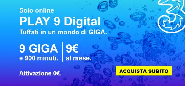Fino al 22 Aprile 2018, salvo eventuali cambiamenti, tutti i nuovi clienti Tre possono scegliere di attivare online l’offerta ricaricabile “Play 9 Digital” a 9 euro al mese e senza alcun costo di attivazione, a differenza della versione standard.