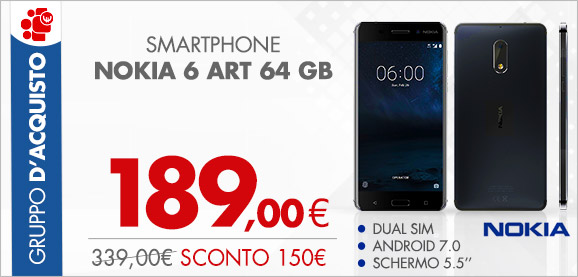 Nokia 6 Art 64 GB acquistabile a 189 euro nel gruppo di acquisto Coop Online fino al 1° Maggio 2018