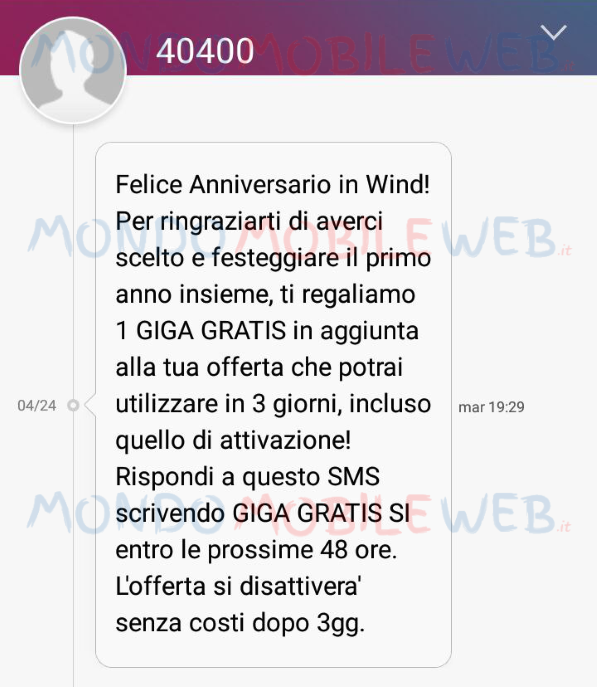 Altri clienti Wind selezionati, che hanno attivato la propria SIM Wind da 1 anno, invece stanno ricevendo un SMS con l’invito di attivare 1 Giga Gratis in 4G da utilizzare in 3 giorni. Ecco l’sms inviato: “Felice Anniversario in Wind! Per ringraziarti di averci scelto e festeggiare il primo anno insieme, ti regaliamo 1 GIGA GRATIS in aggiunta alla tua offerta che potrai utilizzare in 3 giorni, incluso quello di attivazione! Rispondi a questo SMS scrivendo GIGA GRATIS SI entro le prossime 48 ore. L’offerta si disattiverà senza costi dopo 3 gg.“.